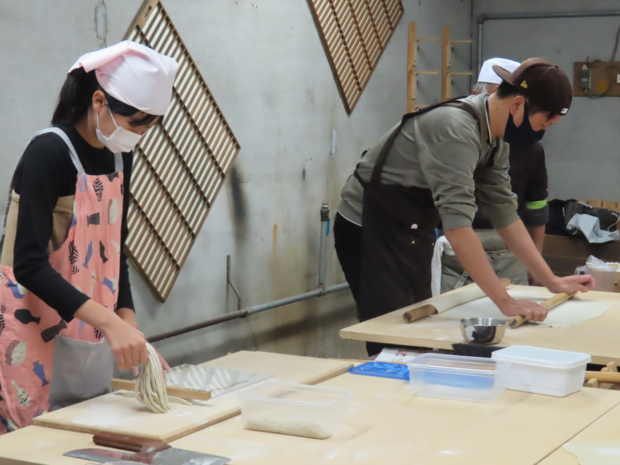 手早くよく練る、ところどころ生地がくっつかないように打ち粉をふる、いびつな形になっている部分は綿棒で外側に押し出すように調節するなど、たくさんのコツを教わり、粉にまみれ?奮闘しました。そば粉と水を人の手で「練り」「のばして」「切る」という、いたってシンプルな作り方ですが、その奥はとても深い。