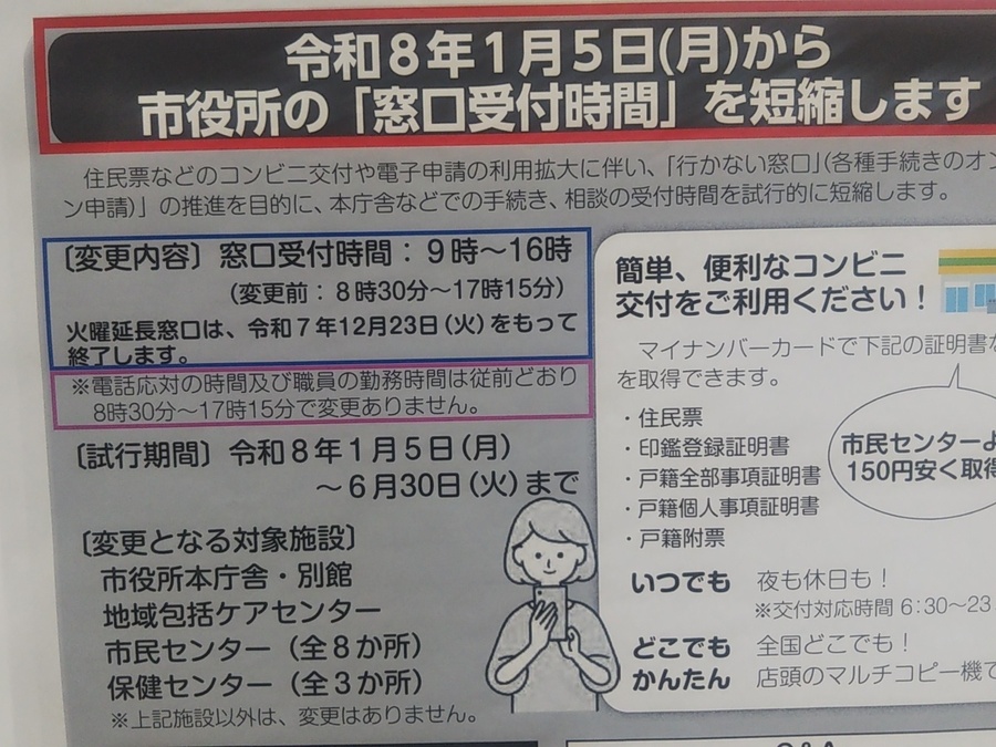 令和8年1月5日(月)より市役所の「窓口受付時間」が短縮されます!