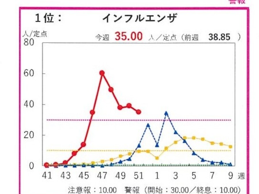 富山県のインフルエンザ患者報告数は第51週(12/15-12/21)で35.00人/定点となり、第47週( 60.83人/定点)をピークに減少はしていますが、警報開始基準の30.0人/定点を超えています(警報レベル)。