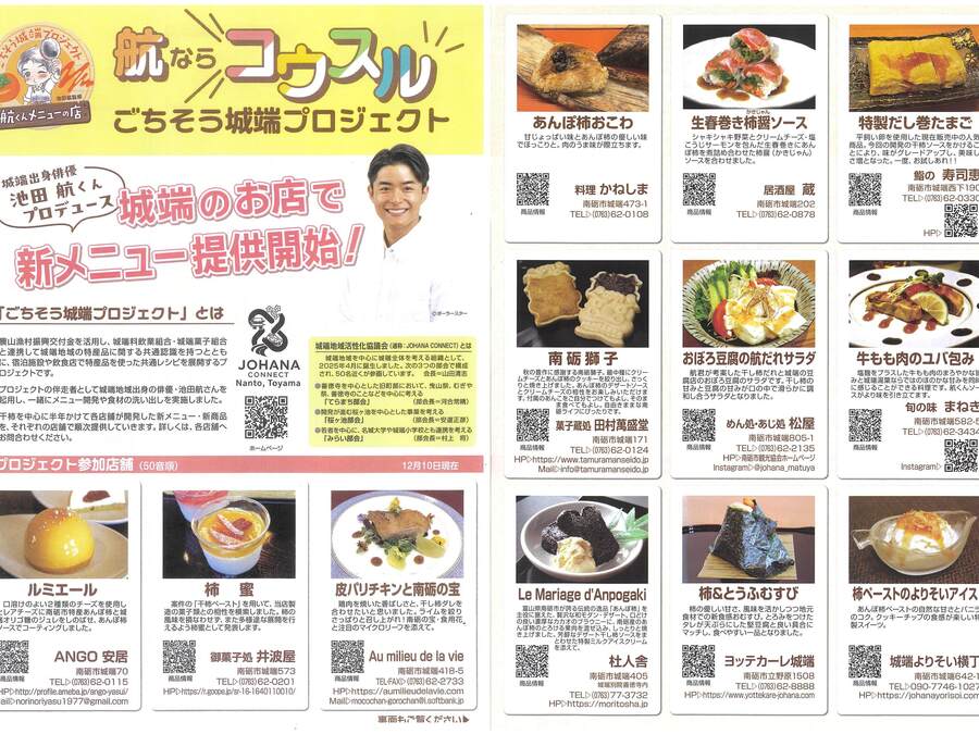 〇プロジェクトの伴走者として城端地域出身の俳優・池田航さんを起用し、一緒にメニュー開発や食材の洗い出しを実施しました。