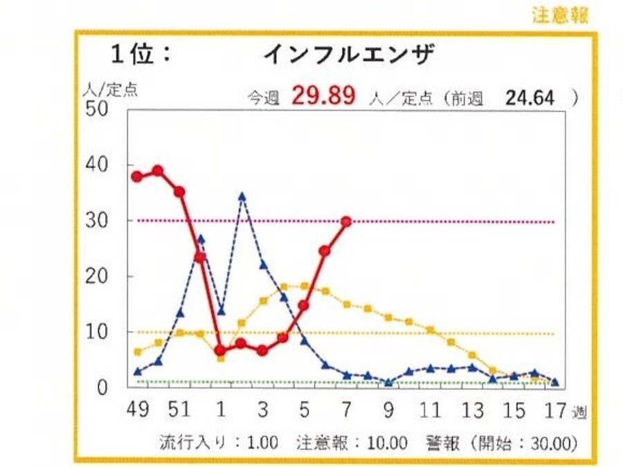 富山県のインフルエンザ患者報告数は第7週(2/9-2/15)で29.89人/定点となり、前週( 24.64人/定点)に引き続き増加傾向がみられ、警報基準の30.0人/定点に近づいています。
