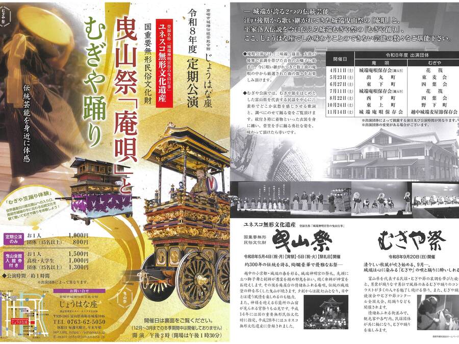 城端が誇る2つの伝統芸能 「城端曳山祭の「庵唄」」「城端むぎや祭の「むぎや踊り」」の令和8年度の定期公演:全7回がはじまります。